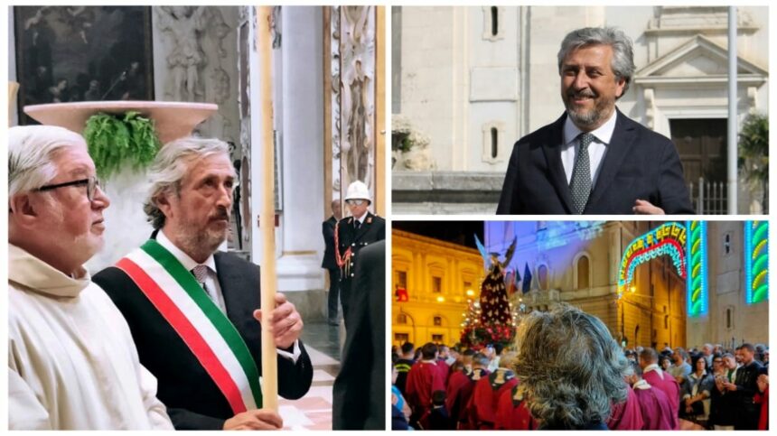 Ma il sindaco, il primo cittadino, come il santo patrono di una città, è un simbolo. Di certo un simbolo transitorio, pro tempore, a differenza dei santi patroni. Ma è sempre un simbolo, nel bene e nel male. E indubbiamente in questo caso, in queste immagini colpisce il confronto tra i due simboli, tra le due figure: quella del sindaco Gambino e quella della statua di San Michele. Giovane, indomita e sfolgorante l’immagine del nostro santo patrono. Mi pare non altrettanto giovane, indomita e sfolgorante quella del sindaco Gambino – quantomeno in queste immagini. Certo, una è un artistico simulacro, un pregevole manufatto del Seicento assunto a simbolo di fede e devozione cittadina, l’altra è la figura di un uomo a noi contemporaneo che ha assunto un complicato e logorante, comunque importante ruolo di potere.