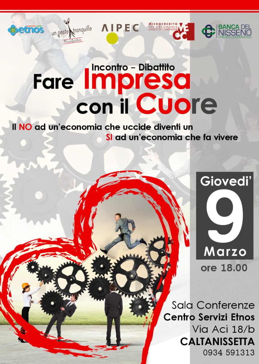 “Fare Impresa con il Cuore” è il titolo chiaro ed inequivocabile che lancia la nuova iniziativa di Etnossoc. coop. Sociale e Un posto Tranquillo srl impresa sociale di avviare un vero e proprio incubatore di imprese che decidono di destinare utili o parte di essi a progetti di valorizzazione del territorio o per garantire processi virtuosi di inclusione sociale di soggetti fragili. Giovedì 9 marzo 2016 presso la sede amministrativa di Etnossoc. coop. Sociale in via Aci 18/b ( villaggio UnrraCasas) alle ore 18 si terrà un incontro formativo ed informativo alla presenza del presidente della MECC – ente erogatore nazionale del Microcredito – dr. Steni Di Piazza e del presidente della Banca del Nisseno dr. Giuseppe Di Forti.