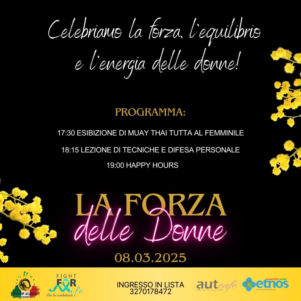 Dopo il successo dell'evento dedicato alla prevenzione oncologica “Fight for life”, la Dragon Academy Group celebra la forza e la bellezza delle donne, con un'esibizione speciale di Muay Tay e una lezione omaggio di 30 minuti di autodifesa personale, nella splendida cornice di Aut Cafè, il bar gelateria solidale di via Rosso di San Secondo. L'appuntamento è per l'8 marzo alle ore 17.30.