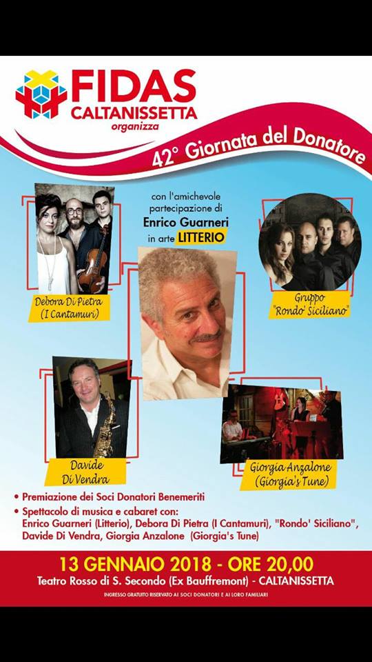 Questa sera al Teatro Rosso di San Secondo spettacolo della Fidas Caltanissetta, presieduta da Carmelo Giardina, per festeggiare la 42esima giornata del donatore. Sul palco un ospite di eccezione Enrico Guarneri, in arte Litterio, e la musica di Debora Di Pietra e i Cantamuri, i Rondo Siciliano, Davide Di Vendra e Giorgia Anzalone con i Giorgia's Tune. Nel corso della serata saranno premiati i soci donatori benemeriti. "Quest'anno abbiamo raggiunto un record storico della nostra sede – ha dichiarato Carmelo Giardina – che ci ha fatto raggiungere le 4.641 donazioni. Ringrazio tutti i donatori e le persone che si spendono in favore di chi ha bisogno, tutto il personale che collabora, dal consiglio direttivo, alla segreteria, dai medici, agli infermieri e il responsabile della campagna scolastica. Invito chi volesse diventare donatore a recarsi presso la nostra sede di viale della Regione 68. Questa sera avremo l'onore di avere con noi il presidente nazionale Aldo Ozino Caligaris. Ci proponiamo di aumentare ancora le nostre donazioni anche perché il nostro fabbisogno si aggira sempre sulle 6 mila donazioni e quindi raggiungere l'autosufficienza".