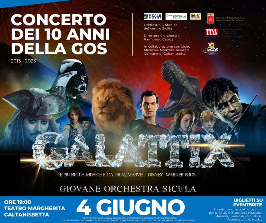 Sono disponibili le prevendite per il gran concerto che si terrà a Caltanissetta il prossimo 4 giugno al Teatro Margherita. GALATTIX – Colonne Sonore il titolo dello spettacolo ideato dalla Giovane Orchestra Sicula per festeggiare i 10 anni dalla nascita. L’orchestra più longeva del Centro Sicilia quindi apre la possibilità di prenotare il posto a sedere per immergersi nell’atmosfera musicale dei film Fantasy, romantici e d’avventura che hanno fatto la storia. Qui il link diretto per le prenotazioni: https://www.eventbrite.it/e/biglietti-galattix-colonne-sonore-633891966937