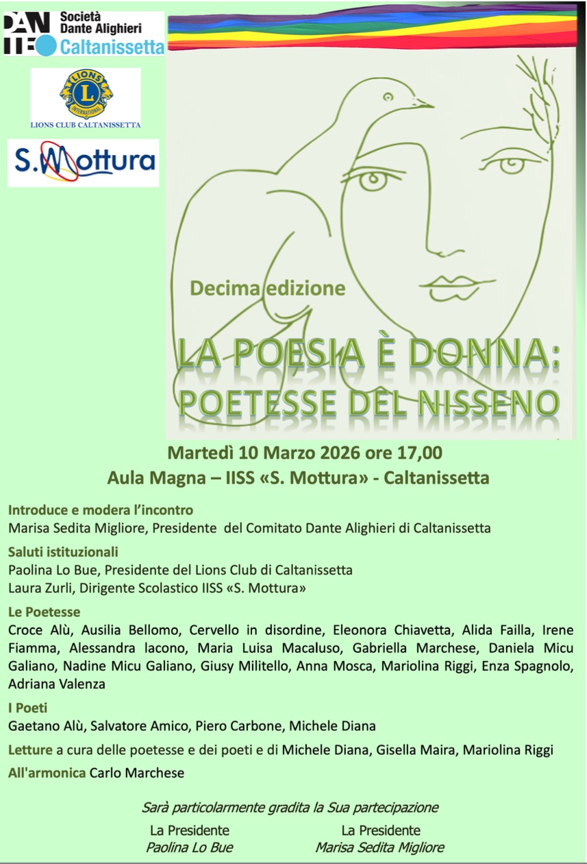 L’iniziativa è promossa dal Comitato di Caltanissetta della Società Dante Alighieri in collaborazione con il Lions Club Caltanissetta e con l’IISS “S. Mottura”. L’evento si propone di dare voce alle autrici del territorio e di offrire un momento di incontro tra poesia, cultura e comunità.