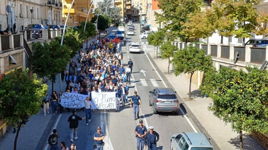 Ma andiamo al dunque: il primo elemento che emerge è la scarsa, scarsissima presenza di studentesse e studenti. Spiace dirlo, ma diciamolo, diciamolo chiaramente: una delusione, un fallimento! In compenso, folto è stato il numero di politici e amministratori locali presenti. Politici e amministratori che hanno abilmente preso possesso della prima fila del corteo portandosi appresso due bianchi lenzuoli con le scritte «Siamo a secco» e «Ci siamo seccati!» Il corteo è partito da Piazza del Marinaio e si è concluso con i previsti interventi, da un grande palco, in Corso Umberto I.
