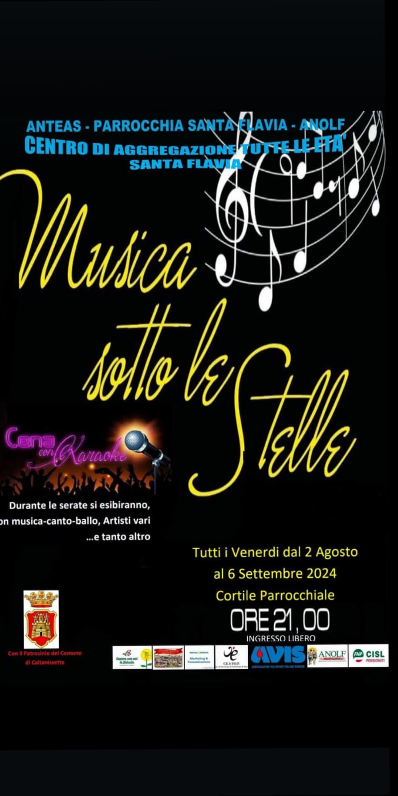 Liborio Fiore, presidente dell’associazione Caltanissetta Solidale, nata allo scopo di promuovere le attività di volontariato, sarà uno degli organizzatori di una serie di eventi che si svolgeranno a Santa Flavia dal 2 agosto al 6 settembre. La kermesse “Musica Sotto le Stelle” che vede il coinvolgimento di diverse associazioni e realtà cittadine prevede spettacoli musicali e cabaret ogni venerdì sera, a partire dalle 21, nel cortile della parrocchia Santa Flavia. “Ringrazio il centro di aggregazione “Tutte le età” di Santa Flavia – dice Liborio Fiore – e le associazioni che ci hanno coinvolto per realizzare questa manifestazione che terrà compagnia ai nisseni per tutto il periodo estivo”.