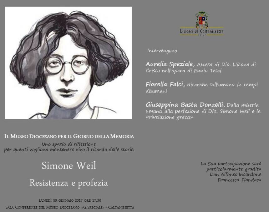 Lunedì 30 gennaio 2017 alle ore 17.30 per celebrare il Giorno della Memoria 2017 il Museo Diocesano del Seminario Vescovile “G. Speciale” invita all’incontro “Simone Weil Resistenza e profezia”. Â Simone Weil, scrittrice e pensatrice francese di famiglia ebrea colta e raffinata, è tra le figure del XX secolo che più interpellano le nostre coscienze. Morì a 34 anni nel letto di un ospedale di Londra, era il 1943, non immaginando che il suo pensiero sarebbe diventato straordinariamente fecondo. Abbracciò con pari entusiasmo il pensiero religioso e quello scientifico, e di entrambi privilegiò l'aspetto meno ortodosso. Oggi ci si interroga se fu una mistica, e non c'è dubbio che il suo pensiero fu sempre esercitato con tutta l'anima, con tutta se stessa, mettendo in discussione la sua vita, e in tal senso dunque profondamente segnato dal misticismo. ”Nulla di quanto la luce della sua mente ha raggiunto è rimasto immutato”. Non c’è sintesi più efficace per connotare la figura di Simone Weil. Gli interventi di Aurelia Speziale, ‘Attesa di Dio. L'icona di Cristo nell'opera di Ennio Tesei’, di Fiorella Falci, ‘Ricerche sull'umano in tempi disumani’, di Giuseppina Basta Donzelli, ‘Dalla miseria umana alla perfezione di Dio: Simone Weil e la “rivelazione greca”’ ’, scandaglieranno da prospettive diverse le profondità del pensiero filosofico, politico e le abbaglianti intuizioni della Weil, consegnandocene la rara coerenza. Lunedì 30 gennaio 2017 alle ore 17.30 nella Sala conferenze del Museo Diocesano.