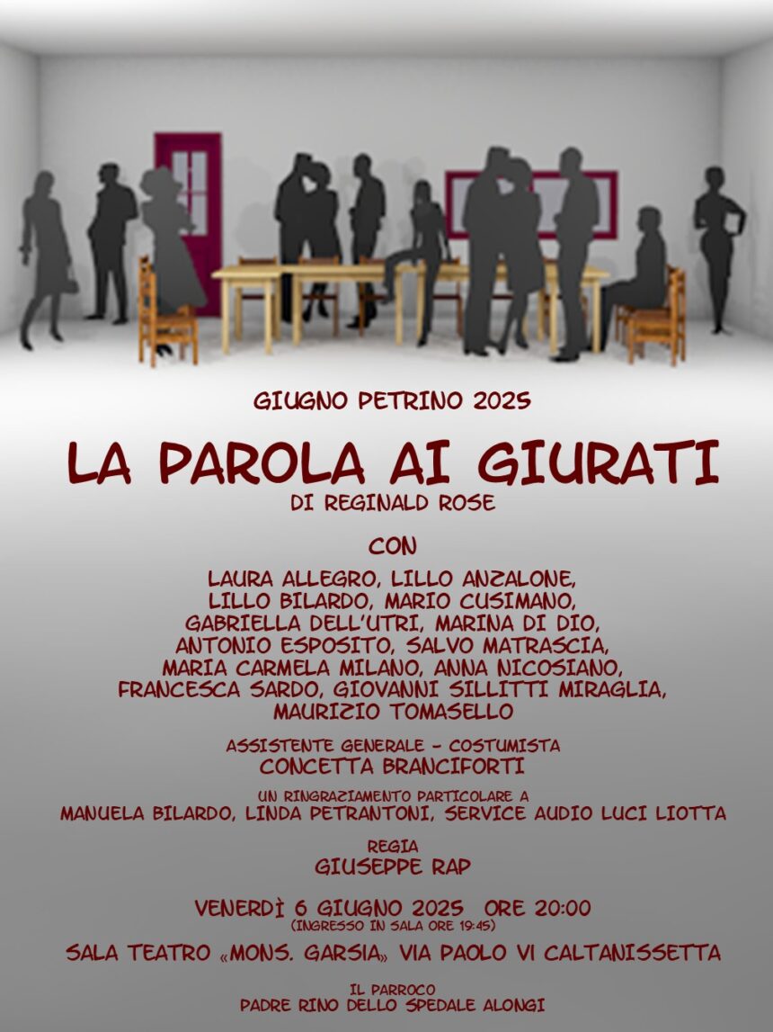 Questa sera alle 20, nell'ambito degli eventi programmati per giugno dalla Parrocchia San Pietro, andrà in scena, nella sala teatro “Monsignor Garsia” di via Paolo VI, lo spettacolo teatrale “La parola ai giurati” per la regia di Giuseppe Rap. Il dramma di Reginald Rose rappresenta, attraverso gli alterni orientamenti di una giuria, la caducità delle convinzioni umane in rapporto alle innumerevoli sfaccettature della realtà, anche quella apparentemente più scontata, e al pregiudizio dei singoli originato dalle vicende personali. Temi da cui deriva una fondamentale critica alla pena di morte. La storia inizia dopo la chiusura dell'ultima udienza in un processo per omicidio. Come in ogni caso di pena capitale, i dodici giurati devono decidere all'unanimità su un verdetto di colpevolezza o di innocenza. Il caso si riferisce a un giovane accusato di aver ucciso il padre. Per tutta la riunione i dodici uomini non si chiamano mai per nome, in quanto non ne sono a conoscenza, ma solo con un numero assegnato ad ognuno. Alla fine, dopo varie contrapposizioni, tutti i giurati tranne uno, convinto dall'inizio dell'assenza di prove decisive, cambiano gradualmente voto, anche più volte, fino ad arrivare all'unanimità al verdetto.