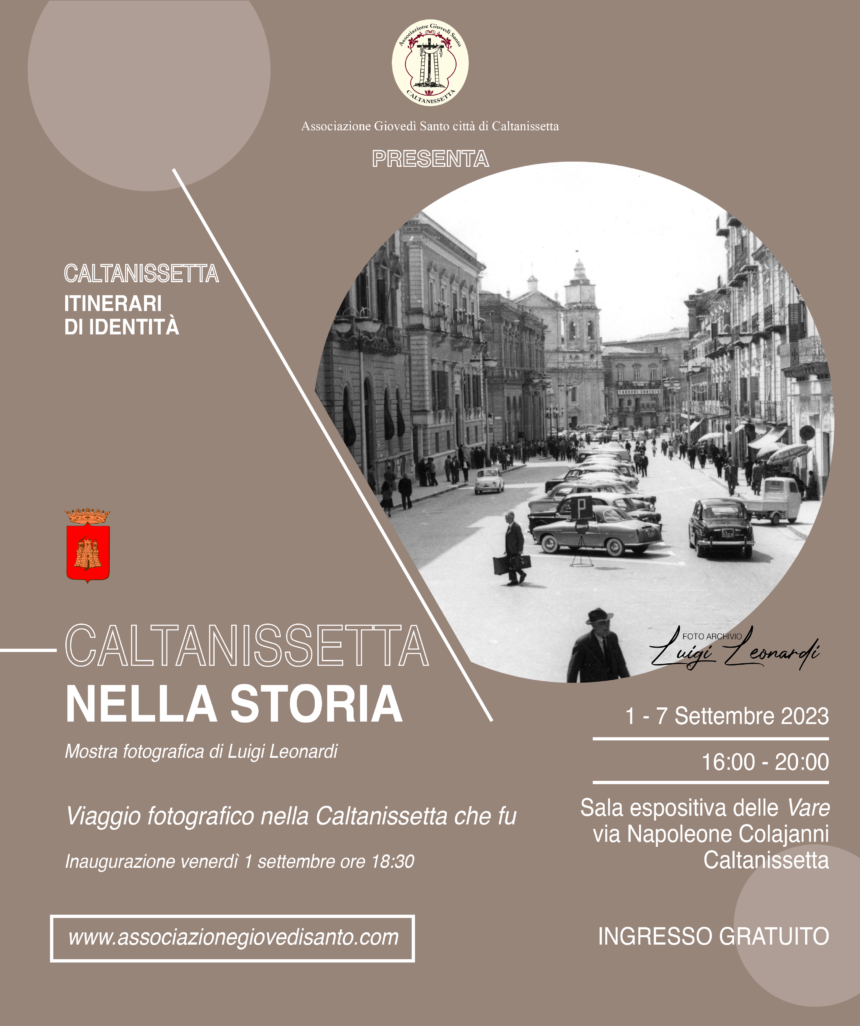 La mostra "Caltanissetta nella storia – viaggio fotografico nella Caltanissetta che fu" presenta un'ampia selezione di fotografie in bianco e nero, ritraendo momenti di vita quotidiana, eventi culturali, luoghi iconici e volti di persone che hanno vissuto e contribuito a definire quel ventennio. Le immagini, scattate con maestria da Luigi Leonardi, famoso fotografo nisseno, catturano l'autenticità e l'intimità di quegli anni, regalando al pubblico una prospettiva unica sul passato.