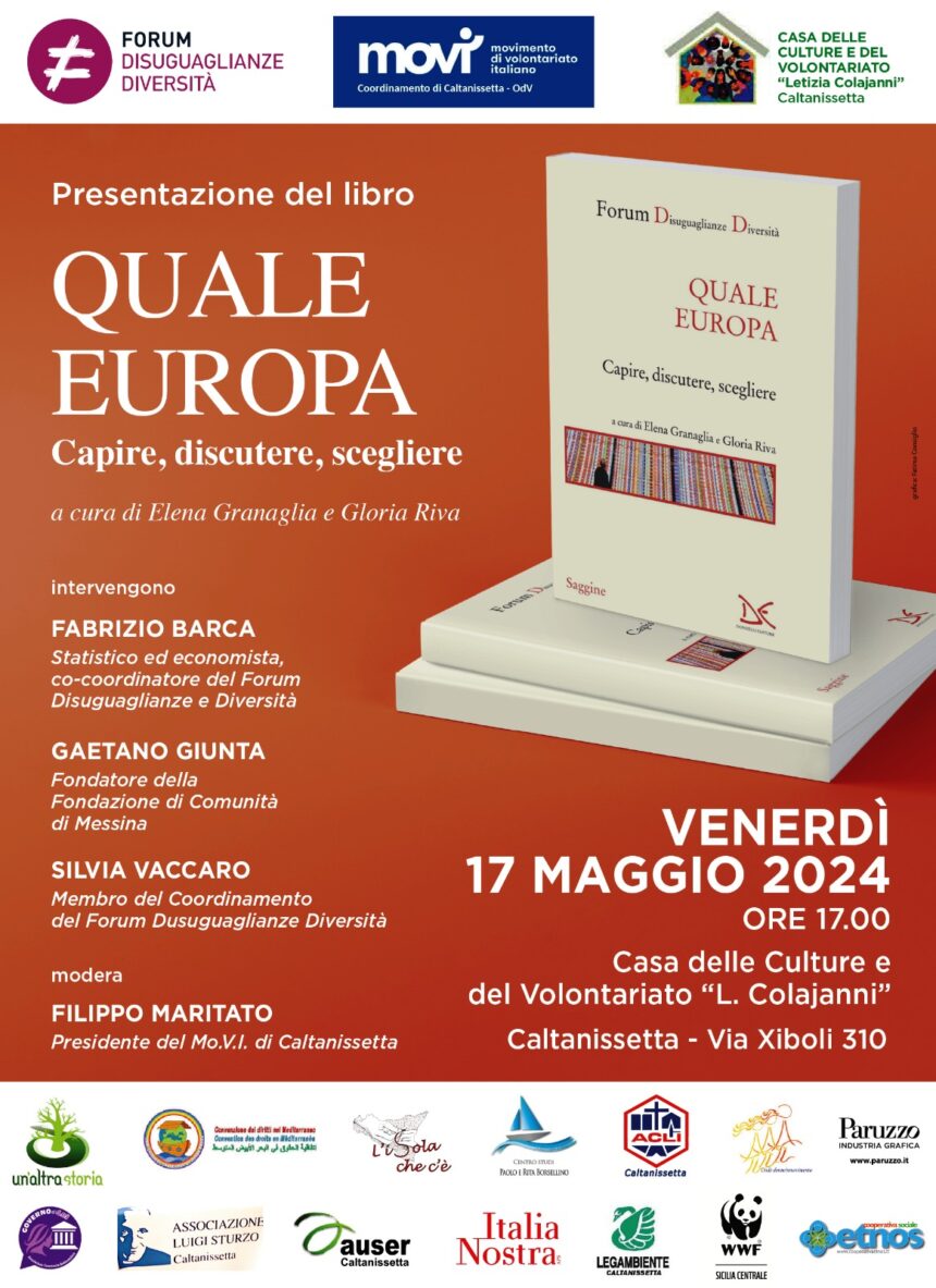 Il libro “Quale Europa” è pubblicato da Donzelli, curato da Elena Granaglia e Gloria Riva, raccoglie tredici saggi tematici di autori e autrici interni o vicini al ForumDD Disuguaglianze Diversità. Hanno aderito come partner all’iniziativa: Un’Altra Storia Sicilia, Convenzione dei Diritti del Mediterraneo, L’Isola che c’è, Centro Studi Paolo e Rita Borsellino, ACLI Caltanissetta, Onde donneinmovimento, Governo di Lei Caltanisetta, Associazione Luigi Sturzo Caltanissetta, AUSER Caltanissetta, Italia Nostra Sicilia, Legambiente Caltanissetta, WWF Centro Sicilia, Etnos.