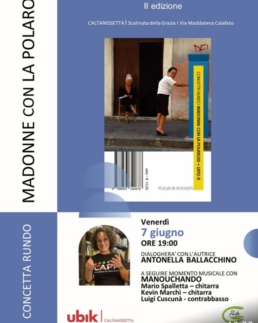 Quarto appuntamento venerdì 7 giugno a Caltanissetta con la II edizione della rassegna culturale “Parole & Note” organizzata dalla libreria Ubik e dal locale Punto G. Nella splendida cornice di piazza Grazia, professionisti ed esponenti del mondo della cultura nisseni dialogheranno con gli autori di alcuni libri di successo. Presentazioni che saranno seguite da momenti musicali. Il nuovo appuntamento è per venerdì 7 giugno alle 19. Concetta Rundo presenterà il suo libro “Madonne con la polaroid”. A dialogare con l'autrice Antonella Ballacchino, medico e poetessa. A seguire un momento musicale con “Manouchando”: Mario Spalletta alla chitarra, Kevin Marchì alla chitarra e Luigi Cuscunà al contrabasso.
