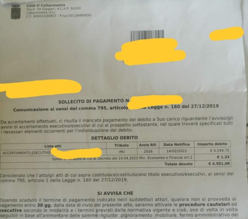 Ha ricevuto un sollecito di pagamento Imu da 4.551 euro ma, a un mese e mezzo dall'arrivo della raccomandata, avere spiegazioni sembra impossibile. A raccontarci l'accaduto è una cittadina nissena che ha ricevuto la "mazzata" dal Comune di Caltanissetta il 30 agosto. Da allora ha cercato di contattare tutti i numeri di telefono indicati nella lettera, ha inviato delle pec, e mail che le sono state riferite al telefono, ma senza risultato. Ad oggi non è dato sapere perché deve pagare quei soldi. "Mi sono recata anche all'Ufficio Tributi – spiega la nostra lettrice – ma è presente una sola persona con persone presenti in fila già dalle 7 del mattino. Una sola persona si occupa di rispondere al telefono, gestire gli utenti presenti, protocollare. Poi a una certa ora ti dicono che l'ufficio chiude e non è presente neanche un tagliacode. Parliamo di un Comune da 60mila abitanti. Non di un piccolo centro. Io prima di pagare questa cifra, che non è una cifra da niente, voglio capire a cosa si riferiscono questi soldi. E' un mio diritto".