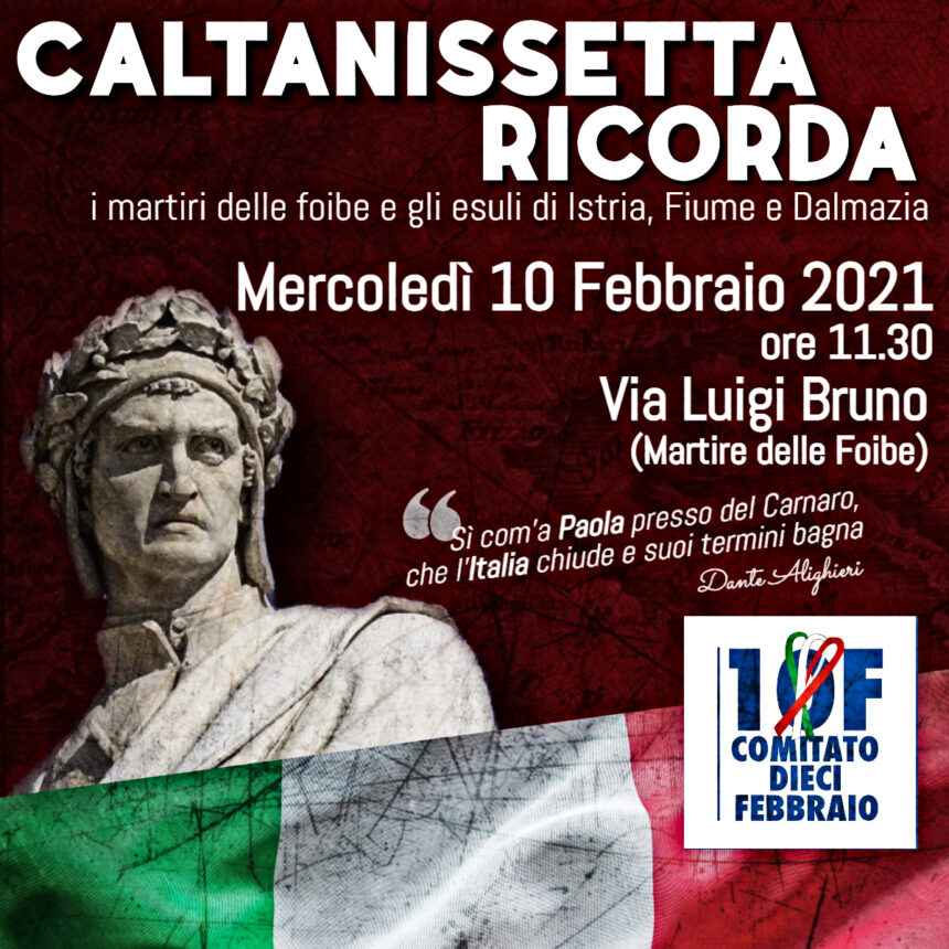 Si svolgerà Mercoledì 10 febbraio 2021, alle ore 11.30, in via Luigi Bruno (martire delle foibe) a Caltanissetta, una breve ma profonda e significativa commemorazione in memoria delle vittime delle foibe, dell’esodo giuliano-dalmata.