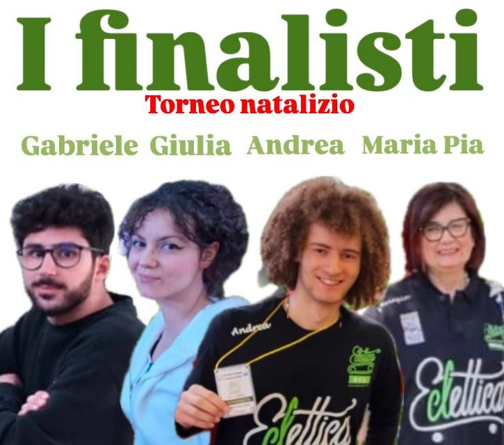 Presso Eclettica Street Factory si sono giocate le semifinali del XVI° torneo (torneo di Natale). Quattro i tavoli e dopo circa due ore di gioco con “sdadata finale” di rito, i quattro che, vincendo ai loro tavoli, vanno in finale sono: Maria Pia Matraxia, Giulia Gulino, Andrea Kiswarday e Gabriele Taschetti (che vince per soli 3 punti fuori obiettivo nei confronti di Giorgia Moscarelli, essendo arrivati a pari punti obiettivo).