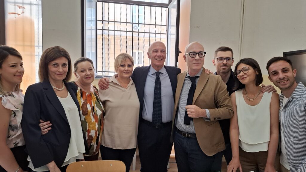 Conclusa la procedura di rito il neoeletto, accompagnato da alcuni rappresentanti della sua coalizione, si è spostato a Palazzo del Carmine dove, nella Sala Gialla, era atteso dal sindaco uscente Roberto Gambino.