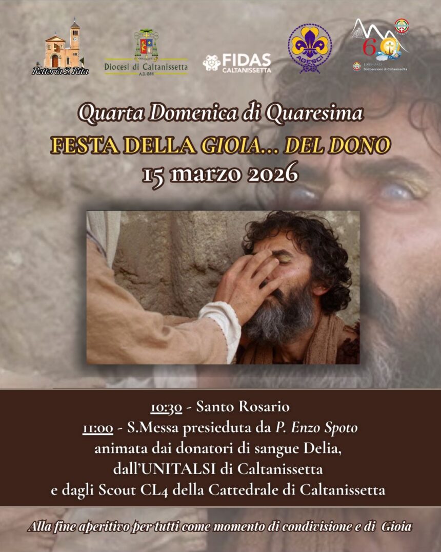 Un momento di spiritualità, condivisione e solidarietà nel cuore del cammino quaresimale. Domenica 15 marzo, in occasione della Quarta Domenica di Quaresima, al Borgo Santa Rita di Caltanissetta si terrà la “Festa della gioia… del dono”, un appuntamento che unisce fede, comunità e attenzione verso il valore del dono. L’iniziativa è promossa dalla Rettoria di Santa Rita, con il coinvolgimento della Diocesi di Caltanissetta, della Fidas Caltanissetta, dell’Agesci e dell’Unitalsi, realtà da sempre impegnate nel promuovere valori di solidarietà e servizio.