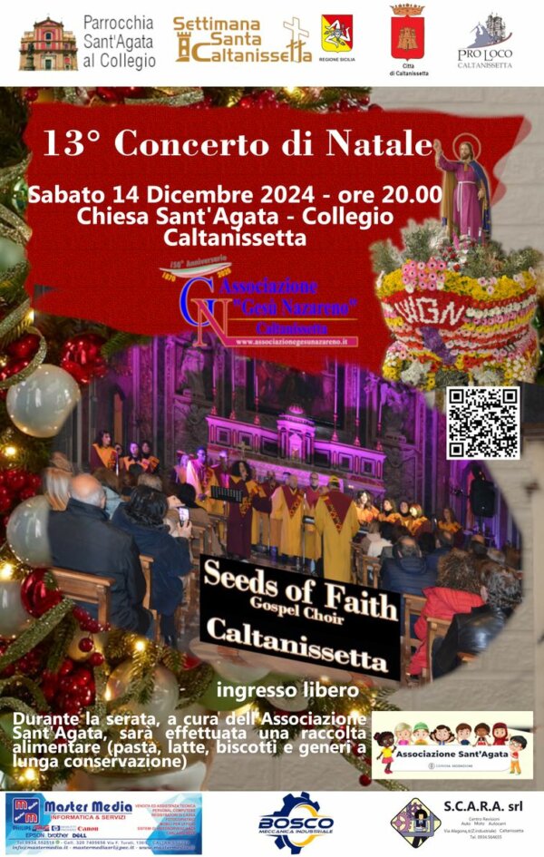 Ci sarà musica, ci sarà canto, ma soprattutto si confida in tanta solidarietà sabato 14 dicembre alle ore 20.00 nella Chiesa di Sant'Agata a Caltanissetta; l'Associazione Gesù Nazareno ripropone, infatti, il Concerto di Natale, ormai giunto alla tredicesima edizione.
