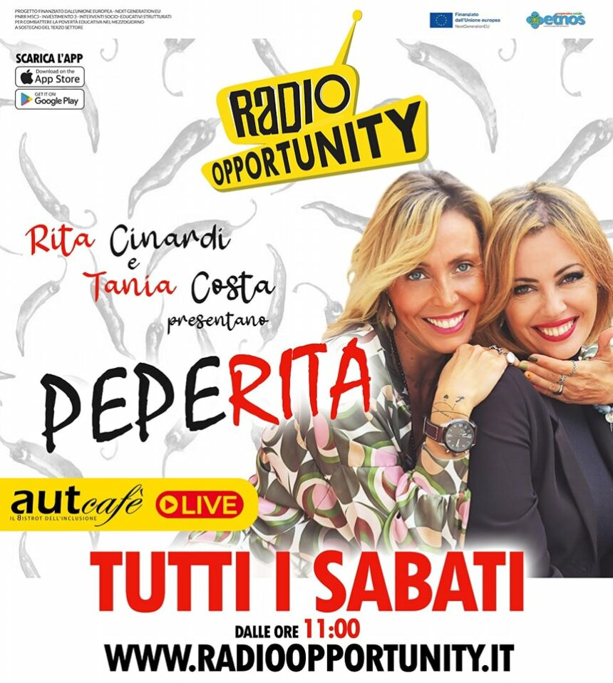 Nuova puntata di Peperita sabato mattina, 9 novembre, a partire dalle 11, all'Aut Cafè di via Rosso di San Secondo a Caltanissetta. A condurre la trasmissione, che andrà in onda in diretta su Radio Opportunity, Rita Cinardi e Tania Costa. Ospiti della puntata Rosangela Zappia che parlerà del progetto “Nuova Bellezza”, della cooperativa Etnos, che coinvolge donne vittime di violenza in attività legate a benessere ed estetica, e Fabio Lega, proprietario dell'agenzia di viaggi Chatal Tour che racconterà quali sono i viaggi più scelti dai nisseni oltre che le sue personali esperienze in giro per il mondo. Sarà possibile seguire la trasmissione direttamente all'interno dell'Aut Cafè o collegandosi sul sito www.radioopportunity.it . E possibile anche scaricare l'App della radio sul proprio smartphone.