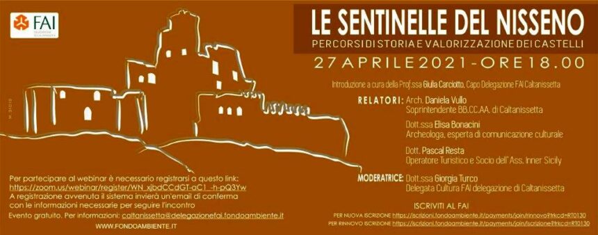 A registrazione avvenuta il sistema invierà un’email di conferma con le informazioni necessarie per seguire l’incontro. Il programma del webinar “Le sentinelle del nisseno, percorsi di storia e valorizzazione dei castelli” prevede dopo i saluti della capo delegazione del FAI di Caltanissetta la prof.ssa Giulia Carciotto, una introduzione della dott.ssa Giorgia Turco, delegata alla cultura del FAI di Caltanissetta che modererà l’incontro, che vedrà gli interventi dell’Arch. Daniela Vullo, Soprintendente dei Beni Culturali della provincia di Caltanissetta, della dott.ssa Elisa Bonacini, archeologa ed esperta di comunicazione culturale, e Pascal Resta, operatore turistico e socio dell’associazione Inner Sicily.