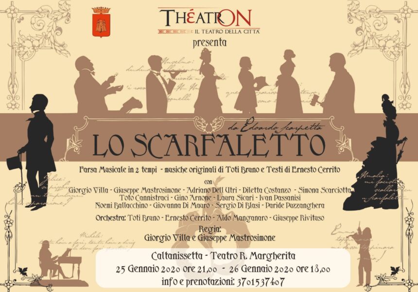 Un clamoroso successo di prevendite quello riscontrato dalla neo compagnia nissena “Theatron” per i due spettacoli previsti sabato 25 e Domenica 26 Gennaio. In scena uno dei classici più amati dal grande pubblico: “Lo scarfaletto”, farsa musicale in due tempi di Eduardo Scarpetta, con il patrocinio del Comune di Caltanissetta. La messa in scena, due atti di puro divertimento, è ambientata alla fine del 1800, ed è caratterizzata da una straordinaria ricerca dei particolari da parte della regia (affidata a Giuseppe Mastrosimone e Giorgio Villa): ben 21 elementi sul palco tra attori, musicisti e ballerini; musiche e testi originali ed orchestra dal vivo; tre installazioni scenografiche con cambi a vista; costumi d'epoca della sartoria palermitana Pipi; con il coinvolgimento di forze artistiche e figure professionali di grande pregio della città (coreografa, scenografi, direttori di palco, macchinisti, costruttori, assistenti, ecc..) e la collaborazione nel dietro le quinte di truccatori e parrucchieri di scena.