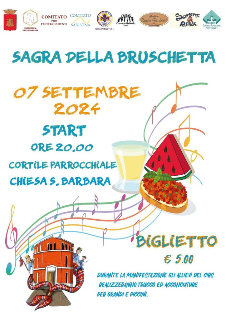 CALTANISSETTA – Sabato 7 settembre, a partire dalle 20 nel cortile della Chiesa Santa Barbara di Caltanissetta, si terrà la terza Sagra della bruschetta. La sagra è oramai una tappa fissa dell’estate nissena, organizzata dal Gruppo Scout Agesci Caltanissetta 9, in collaborazione con la Parrocchia Santa Barbara, il Comitato pro festeggiamenti di Santa Barbara e l’associazione Sabucina.