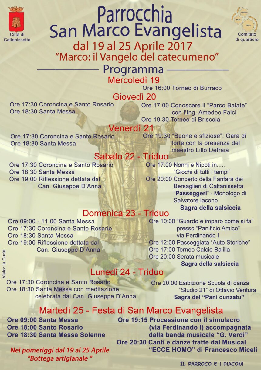 La Parrocchia San Marco Evangelista, con la collaborazione del Comitato di Quartiere Balate/Pinzelli e il patrocinio del Comune di Caltanissetta, organizza la terza festa del comprensorio nella ricorrenza di San Marco Evangelista il 25 aprile. L’evento si svolgerà dal 19 al 25 aprile 2017 come da programma. Maggiori dettagli sono disponibili nei numerosi eventi pubblicati in facebook. Di seguito il link dell'evento riepilogativo delle manifestazioni.