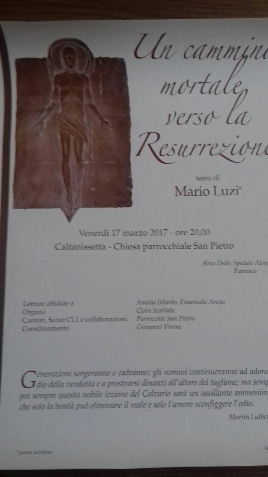 Si terrà venerdì 17 marzo alle ore 20 presso la parrocchia S. Pietro di Caltanissetta la via crucis meditata “Un cammino mortale verso la Resurrezione”. Dopo la suggestiva e commovente via crucis realizzata lo scorso anno il parroco di S. Pietro, Rino Dello Spedale Alongi, è lieto di riproporre una versione rivista della Via Crucis del poeta scrittore Mario Luzi realizzata al Colosseo e presieduta dal Santo Padre Giovanni Paolo II in occasione della Pasqua del 1999. Si tratta di un'altissima meditazione sull'incarnazione, la morte e la resurrezione di Gesù, rivolta a laici e credenti. Lo stesso Luzi ricorda che, quando gli venne proposto di scrivere questo testo, “l'immaginazione già in moto mi prefigurò un testo poematico di cui Gesù fosse l'unico agonista. In un ininterrotto monologo Gesù nella tribolazione della Via Crucis avrebbe confidato al Padre la sua angoscia e i suoi pensieri dibattuti tra il divino e l'umano, la sua afflizione e la sua soprannaturale certezza.”