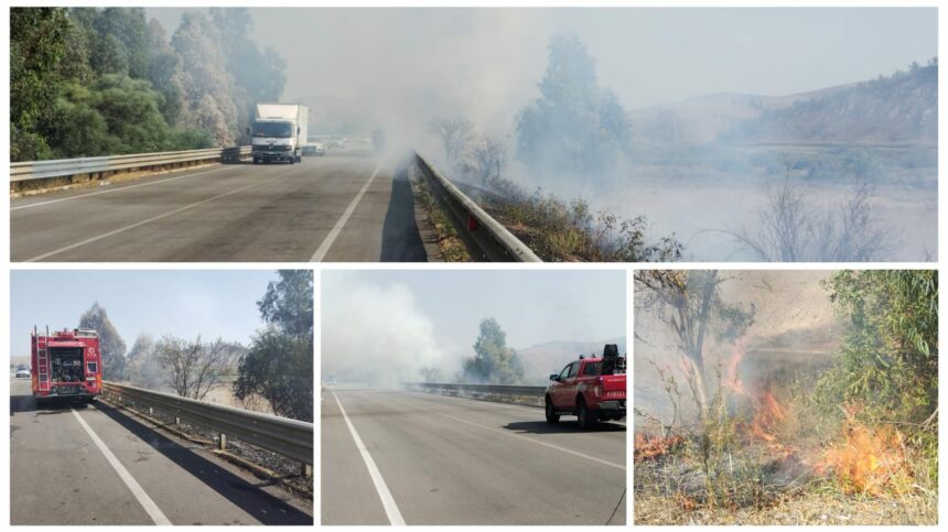 Un vasto incendio di sterpaglie e sottobosco sta tenendo impegnati i vigili del fuoco sulla Ss626, al km 10, a Caltanissetta. Il fumo ha invaso la carreggiata ed è stato necessario l'intervento della polizia stradale per regolare il traffico. Il rogo sta interessando i terreni nelle vicinanze della strada statale in entrambi i sensi di marcia. Tre i mezzi dei vigili del fuoco impegnati e mezzi del corpo forestale. Oggi e domani è prevista l'allerta in Sicilia per caldo e incendi. Il vento di scirocco infatti starebbe alimentando le fiamme in diverse zone della Sicilia. (Foto Seguo News)