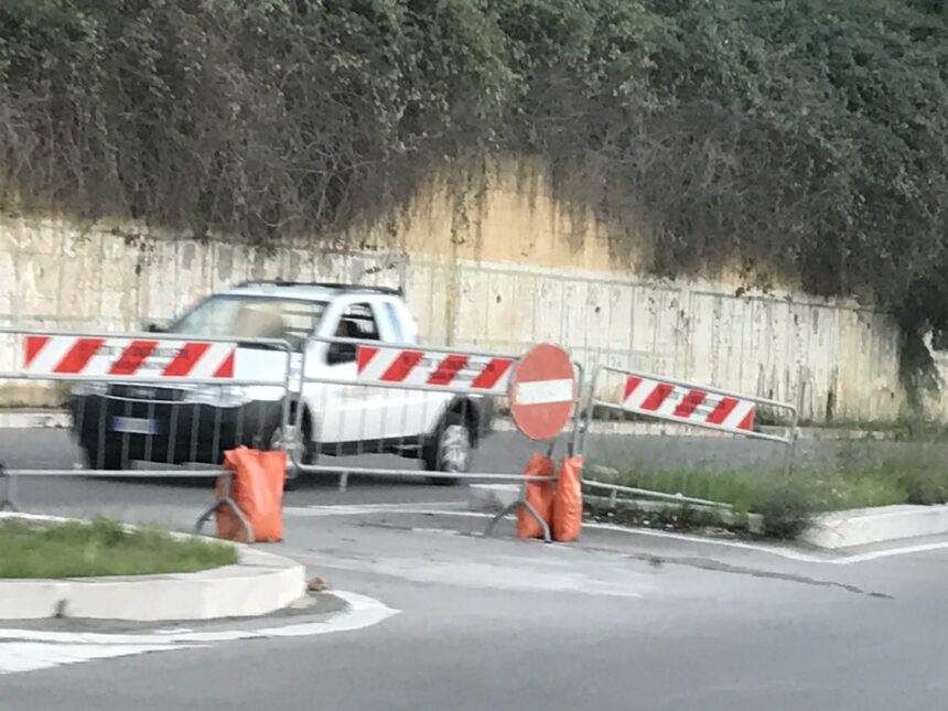 La rotatoria è ancora transennata e presenta i segnali di divieto di accesso ( senso vietato) non potendo di fatto far impegnare l'anello del senso rotatorio .