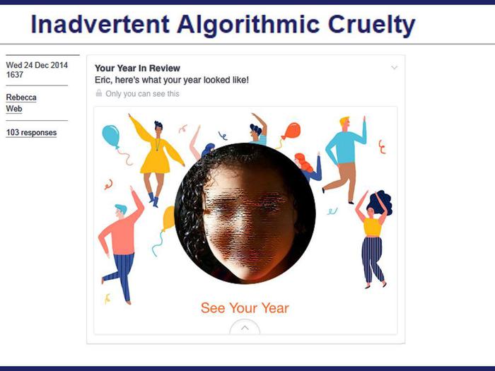 “Èstato un anno meraviglioso. Grazie di aver contribuito a renderlo tale”, recitano i post. Ma l'algoritmo non può tenere conto di momenti tristi ed evitarli. Così capita che il calcolatore diventa casualmente crudele nei confronti di alcuni utenti. E' capitato ad Eric Meyer, scrittore e consulente di web design, che nel 2014 ha perso sua figlia per un cancro al cervello, il giorno del suo sesto compleanno. Meyer, come ha scritto sul suo blog, aveva volontariamente evitato di guardare l’anteprima del suo anno, ma Facebook gli ha presentato questa anteprima lo stesso sul newsfeed, con la foto della figlia scomparsa circondata da omini stilizzati che fanno festa.