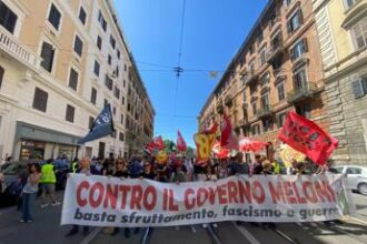 Corteo a Roma contro il governo, bandiere rosse e della Palestina a piazza Vittorio