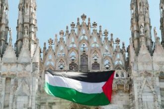 Nuovo blitz di Apuzzo, srotola bandiera della Palestina sul Duomo di Milano