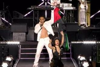 (Adnkronos) - Cosmo con la bandiera palestinese sul palco del concerto del…