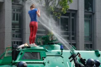 Arrampicata su un blindato delle forze dell'ordine, mentre gli agenti rispondono con…