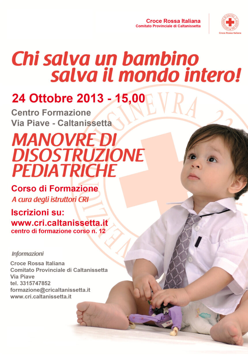 Si svolgerà giorno 24 ottobre 2013 alle ore 15.00 presso il Centro di Formazione della Croce Rossa Italiana di Caltanissetta, sito in Via Piave a Caltanissetta, presso l’istituto Testasecca un corso di “Manovre di disostruzione delle vie aeree in età pediatrica”;