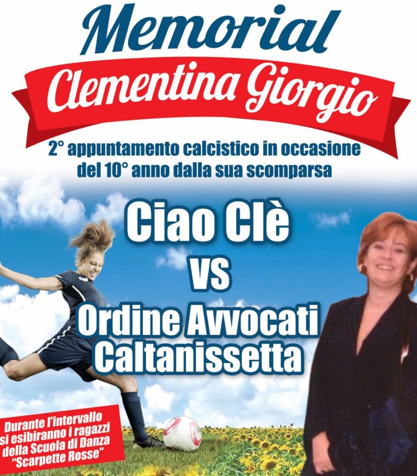 Al via la seconda edizione del memorial “Ciao Clè”, la manifestazione nata per ricordare Clementina Giorgio, la direttrice del Confidi Caltanissetta morta prematuramente 10 anni fa. Oggi alle ore 19 allo stadio Palmintelli di Caltanissetta si svolgerà un match tra la formazione di Ciao Clè e la squadra degli Ordini degli Avvocati. Durante l'intervallo si esibiranno gli allievi della scuola di danza “Scarpette Rosse”. L'ingresso è gratuito. Durante la partita saranno messi in vendita cd contenenti canzoni realizzate da autori nisseni. L'incasso sarà devoluto all'associazione Amici dell'Ematologia di Pavia, per la costruzione del progetto “Fanny”. Per maggiori informazioni è possibile contattare il numero 3270539474 o visitare il sito www.aeponlus.it .