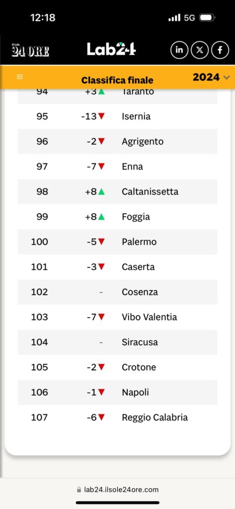Caltanissetta non è più ultima ma 98esima nella classifica sulla qualità della vita del SOLE 24 ORE che fotografa il benessere dei territori e che vede Bergamo sul gradino più alto del podio per la prima volta. Nella top 10 trionfa il Nord-Est mentre le grandi città, al netto di Bologna (9ª), scendono di diverse posizioni: Milano è 12ª, Firenze 36ª e Roma al 59° posto. Il Sud rimane fanalino di coda, con Reggio Calabria in maglia nera, ma ci sono segnali positivi. Quello che si nota guardando il fondo della classifica è che Foggia e Caltanissetta sono entrambe riuscite a risalire, in quest'ultimo anno, ben 8 posizioni a differenza di altre province che sono scese oppure sono rimaste dov'erano. “A giugno 2019 – dichiara l'ex sindaco Roberto Gambino, oggi consigliere comunale di opposizione – la classifica del SOLE 24 ORE, vedeva la provincia di Caltanissetta al 107* posto, adesso ci troviamo al 98*, una lenta risalita ottenuta grazie al duro lavoro dei 22 sindaci per cinque lunghi anni. Non sorprende il dato peggiore, siamo ultimi per saldo migratorio totale, mentre ci lascia sperare il secondo posto in Italia per incremento del Pil pro capite. Molte altre graduatorie ci vedono protagonisti come giustizia e sicurezza, ecosistema urbano e digitalizzazione in cui la nostra città ha ricoperto e continua a ricoprire un ruolo di primo piano a livello nazionale. Il mio auspicio è che si continui a percorrere la strada tracciata”.