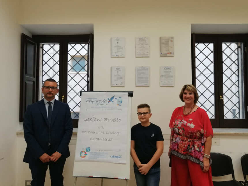 Ad accompagnare Stefano – che ha ritirato il premio alla presenza del direttore generale di Caltaqua Andrea Gallè e della responsabile comunicazione e marketing Lea Romano – i genitori e l’insegnante Maria Grazia Giammorcaro.