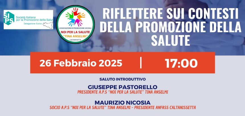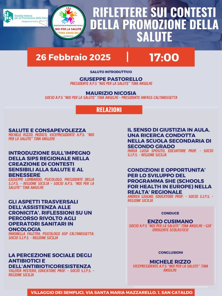 La Società Italiana per la Promozione della Salute (SIPS) – Delegazione della Regione Sicilia e l'Associazione di Promozione Sociale “Noi per la Salute – Tina Anselmi” di Caltanissetta hanno organizzato un convegno Mercoled' 26 Febbraio alle ore 17 al Villaggio dei Semplici, Via Santa Maria Mazzarello 1, San Cataldo sul tema “Riflettere sui contesti della Promozione della Salute” con il quale si intende proporre ad un pubblico non solo di addetti ai lavori l'esigenza di investire sui contesti che a vario titolo riguardano la promozione della salute e del benessere, come la scuola o i servizi sanitari.