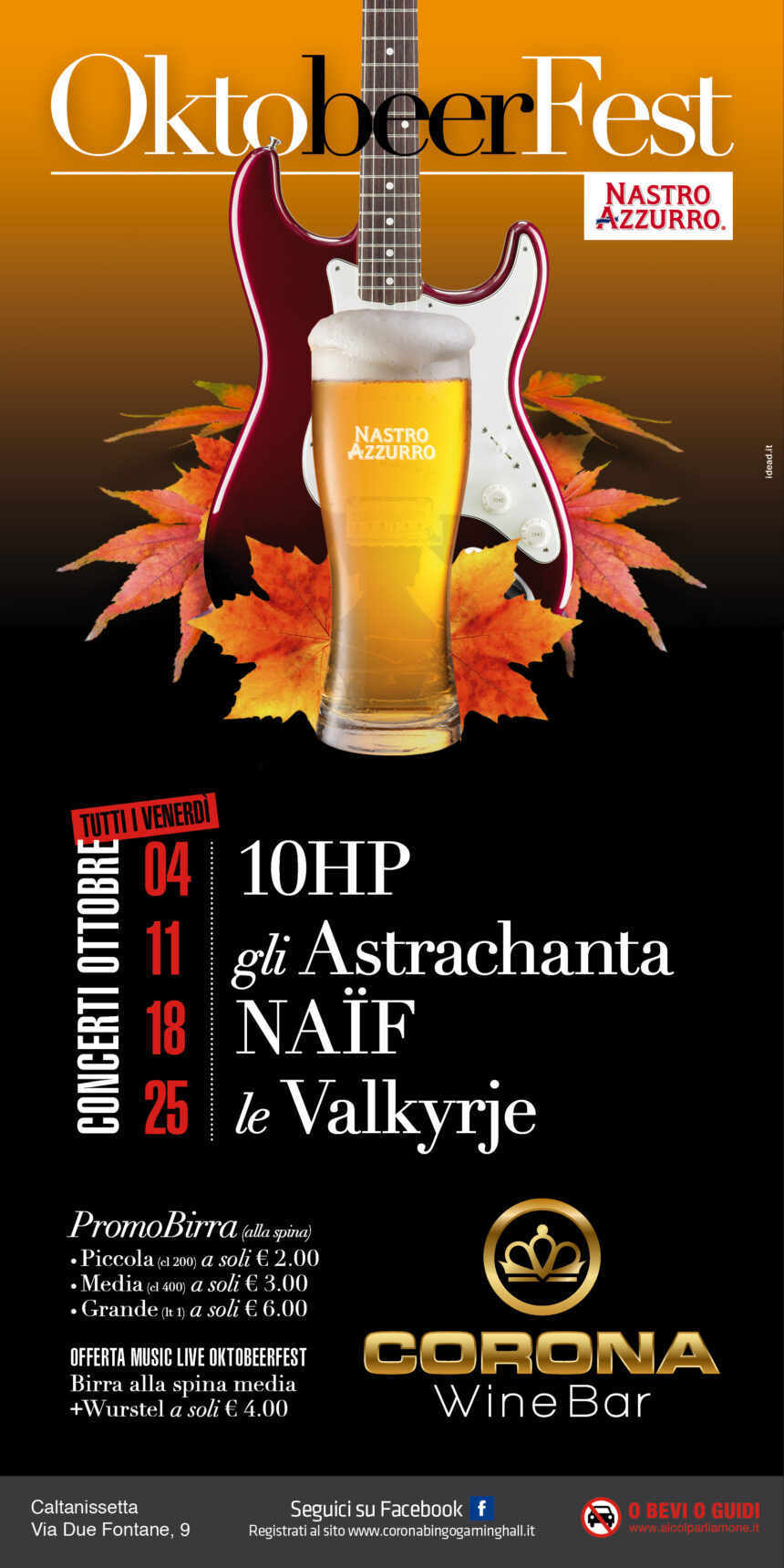 E’ l’abbinamento ideale gusto&sound che richiama l’atmosfera tipica del rinomato festival popolare di Monaco di Baviera. Stasera – con start alle ore 21 inizia una nuova stagione di eventi al Corona Wine Bar di via Due Fontane, a Caltanissetta: è l’OktobeerFest realizzato in collaborazione con Nastro Azzurro, manifestazione che coniuga musica e puro malto. Già, perchè per tutti i venerdì del mese al Corona Wine Bar sarà possibile gustare la birra alla spina di qualità e wurstel – al prezzo di 4 euro – ascoltando band musicali che proporranno i loro brani dal vivo. Stasera calcheranno il palcoscenico gli Astracantha, 4 ragazzi provenienti da alcuni dei piccolissimi borghi madoniti di Petralia Soprana, nel cuore della Sicilia. Suonano le “vecchie” intramontabili canzoni del Rock italiano degli anni '70. Melodie forse anche un po' retrò quelle dei loro brani inediti, scritti dalla voce del gruppo, Donatella Li Puma. Con lei anche Filippo Ceraolo (chitarra), Biagio Li Puma (basso) e Dario Maria Scelfo (batteria). Per maggiori info contattare 0934 593555 o metti Mi piace sulla fan page Corona Bingo Gaming Hall.