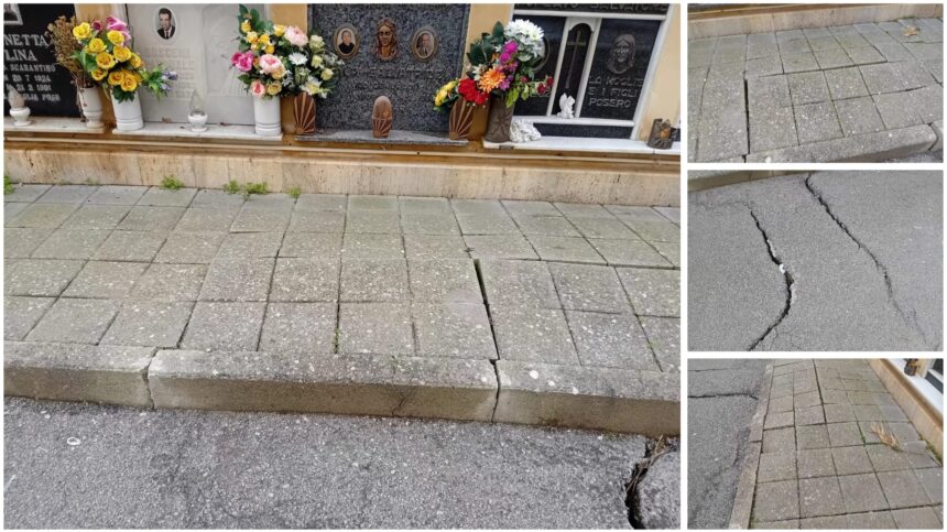 Gradini sconnessi, lastre sollevate e crepe evidenti sull’asfalto: è questo lo stato della pavimentazione nella parte bassa del cimitero Angeli, all’altezza della sezione 293, come documentano le fotografie inviate alla redazione di Seguo News da un lettore. Dalle immagini emerge una situazione di degrado strutturale diffuso. I blocchetti in cemento del camminamento risultano in più punti fuori asse, con dislivelli marcati tra una lastra e l’altra. In alcuni tratti si notano vere e proprie fessure, sia nella pavimentazione pedonale sia nella strada adiacente, segno di un possibile cedimento del sottofondo. Le superfici irregolari, unite alla presenza di erbacce che crescono tra le fughe, aumentano il rischio di inciampo, soprattutto per persone anziane o con difficoltà motorie, che frequentano quotidianamente il cimitero. La zona interessata si trova in prossimità di loculi e cappelle, un’area quindi molto frequentata durante le visite ai defunti. “In certi punti bisogna guardare continuamente dove si mettono i piedi”, segnala il lettore, sottolineando come la situazione sia peggiorata nel tempo senza interventi visibili di manutenzione. La segnalazione riporta l’attenzione su un tema più ampio: la sicurezza e il decoro degli spazi cimiteriali, che dovrebbero garantire accessibilità e rispetto, soprattutto in luoghi di raccoglimento. La redazione di Seguo News resta a disposizione per eventuali riscontri da parte dell’amministrazione o dell’ente gestore del cimitero.