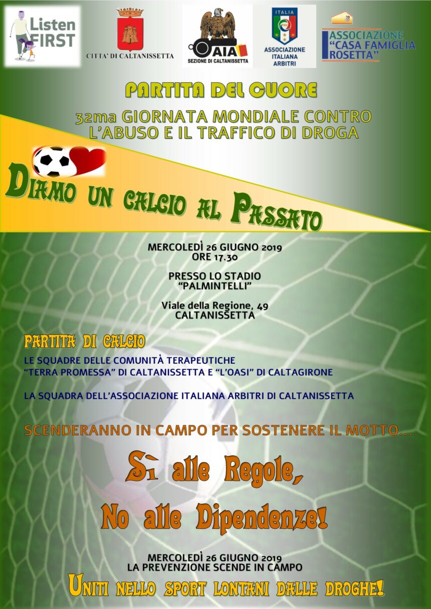 Mercoledì 26 Giugno 2019, in occasione della "32ma Giornata Mondiale contro l’abuso e il traffico di droga”, l’Associazione “Casa Famiglia Rosetta” organizzerà la partita del cuore dal titolo “Diamo un calcio al Passato”.