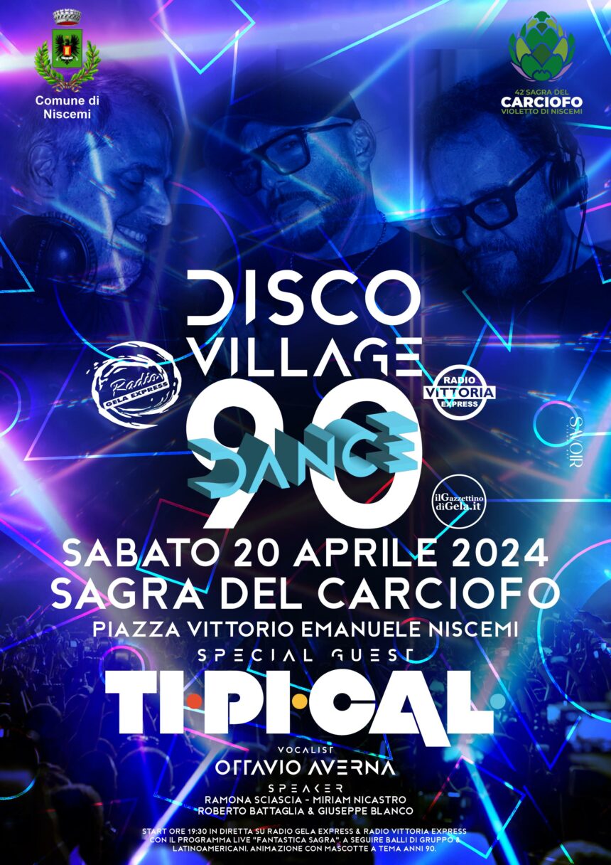 Disco Village 90 Dance in Tour. Start sabato 20 aprile prossimo in occasione della 42esima edizione della sagra del carciofo violetto di Niscemi. Sette ore di intrattenimento musicale con le migliori hit degli anni 90 e del 2000 con la partecipazione straordinaria dei Tipical. Il format radiofonico in versione live sarà trasmesso in diretta su Radio Gela Express e Radio Vittoria Express a partire dalle 19,30 per concludersi alle 02.00.