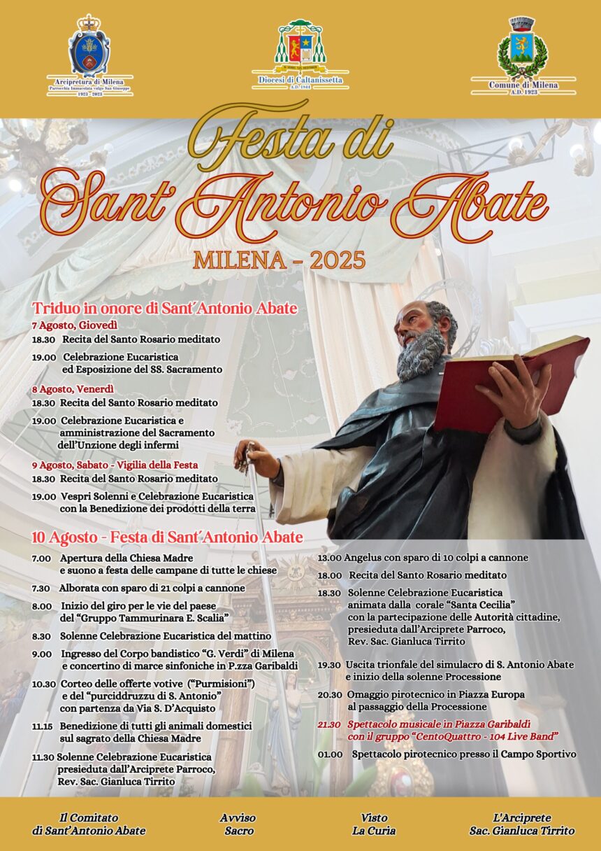 Si svolgerà Domenica prossima, 10 agosto, a Milena, il “Paese delle Robbe” in Provincia di Caltanissetta, la festa di Sant’Antonio Abate, giunta ormai alla sua 129esima edizione consecutiva. Un appuntamento di fede e di folclore che nella seconda domenica di agosto di ogni anno rappresenta il clou dell’estate milenese. Per il diciottesimo anno consecutivo l’organizzazione dell’evento è curata dall’apposito Comitato, con il contributo dell’Amministrazione Comunale guidata dal Sindaco, Dott. Claudio Cipolla e la regia del nuovo Arciprete Parroco di Milena, il giovane Sacerdote Don Gianluca Tirrito, nativo di San Cataldo.