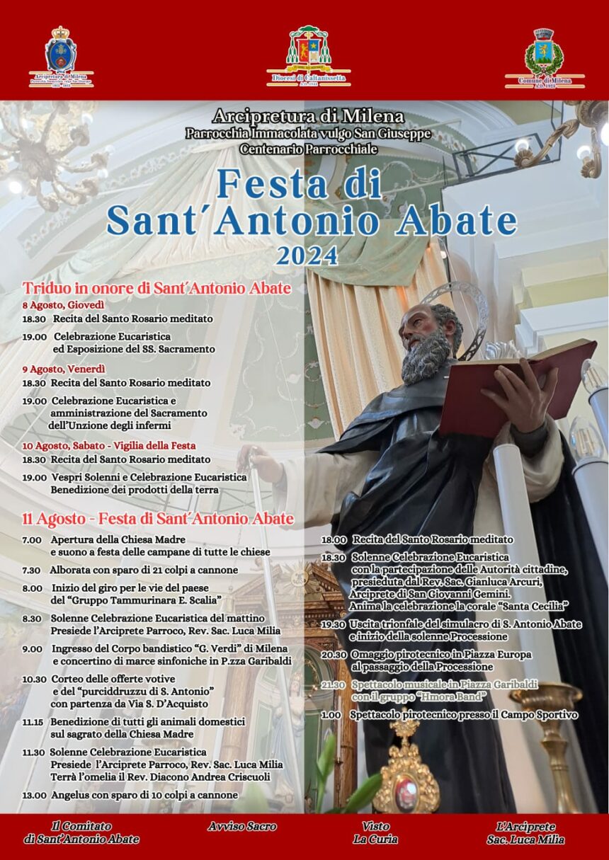 Si svolgerà Domenica 11 agosto, a Milena, il “Paese delle Robbe” in Provincia di Caltanissetta, la festa di Sant’Antonio Abate, giunta ormai alla sua 128esima edizione consecutiva. Un appuntamento di fede e di folclore che nella seconda domenica di agosto di ogni anno rappresenta il clou dell’estate milenese. Per il diciassettesimo anno consecutivo l’organizzazione dell’evento è curata dall’apposito Comitato, con il contributo dell’Amministrazione Comunale guidata dal Sindaco, Dott. Claudio Cipolla e la sapiente regia dell’Arciprete Parroco, Sac. Don Luca Milia.