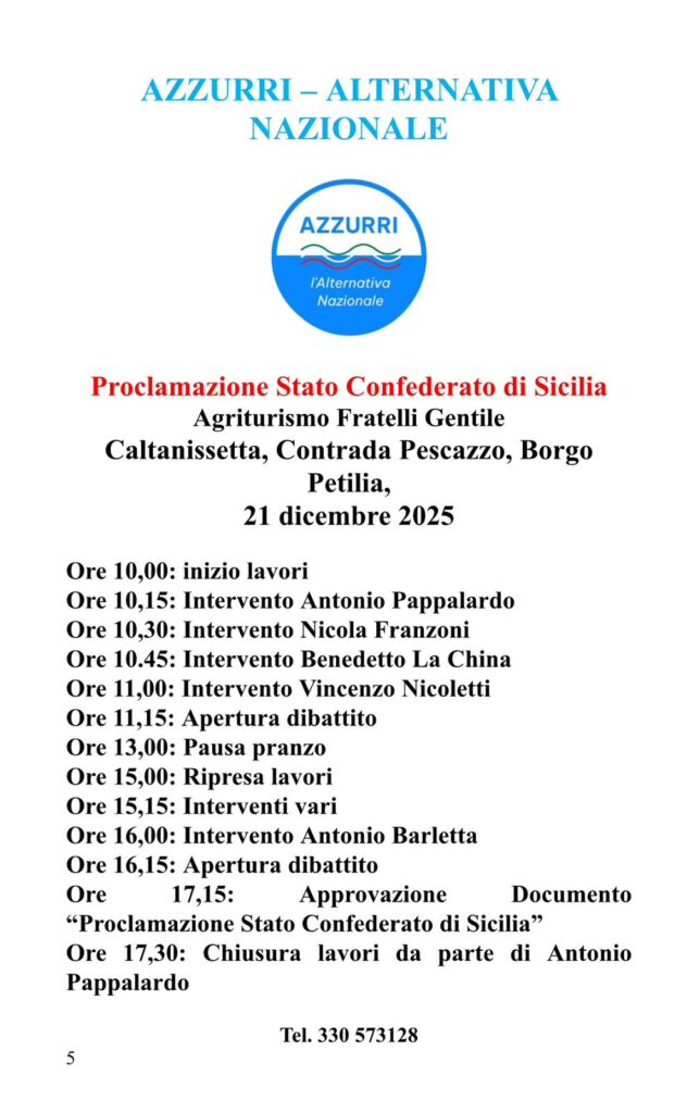 Nel corso del suo intervento, Benedetto La China comunicherà che, nel mese di gennaio, è prevista l’apertura della prima segreteria politica del movimento a Palermo, insieme al generale Antonio Pappalardo, dando avvio al processo di strutturazione territoriale di Alternativa Nazionale in Sicilia.