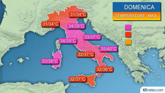 Domenica: l'anticiclone africano raggiunge la sua massima espansione sull'Italia centrale con massime fino a 39°C in Toscana, Umbria, Emilia Romagna, 40°C sul Tavoliere. Altrove valori comunque elevati e sopra media nonostante un primo passaggio temporalesco sulle Alpi. Litorali meno roventi ma con afa spesso opprimente.