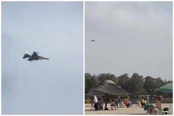 (Adnkronos) – In spiaggia a Dubai ombrelloni aperti e turisti in costume, in cielo scene di guerra. Un video condiviso sui social mostra un F-16E dell'aeronautica militare degli Emirati Arabi Uniti che piomba a bassa quota sulla spiaggia di Al Mamzar per abbattere un drone iraniano in avvicinamento. La scena è rapida, le persone in spiaggia restano dove sono ma alzano gli occhi al cielo per seguire ciò che sta accadendo.