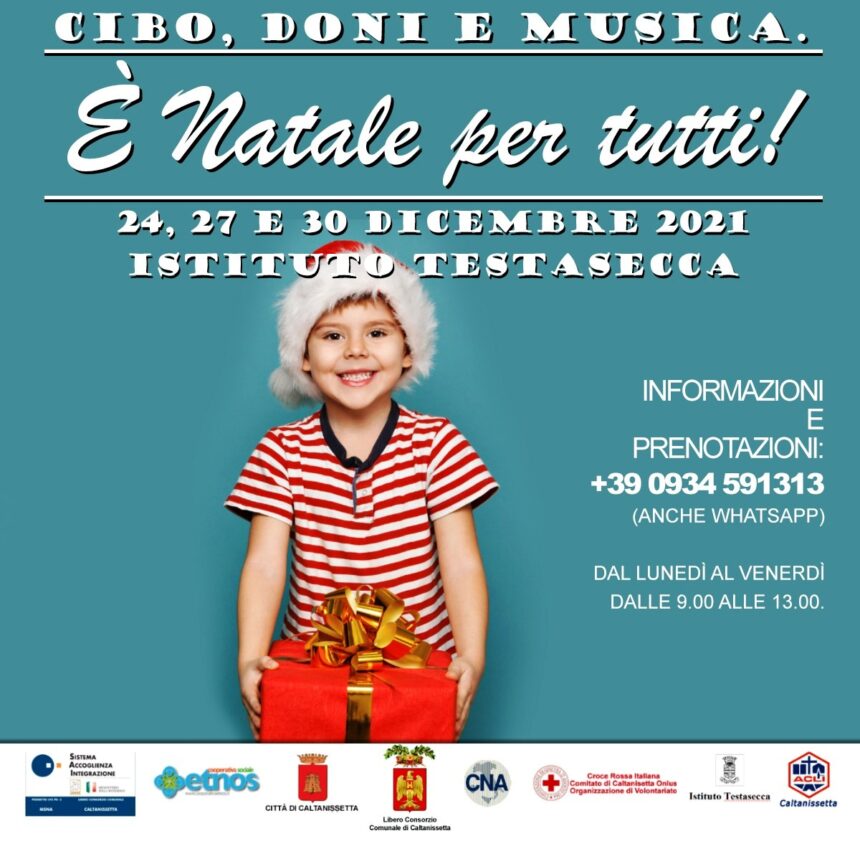 Nei giorni 24 – dalle 11:00 alle 13:00 –, 27 e 30 – dalle 17:00 alle 20:00 – ,dicembre 2021, presso il Fantaboschio – Un nido di coccole, viale della Regione,1 ‒, la Cooperativa Sociale Etnos, insieme a Croce Rossa Italiana Comitato Caltanissetta, Acli Caltanissetta, CNA Caltanissetta, Istituto Testasecca, Libero Consorzio Comunale Caltanissetta, SAI – Sistema Accoglienza Integrazione, organizza “È Natale per tutti – cibo, doni e musica”. È un evento solidale e sociale che si pone l’obiettivo di ricreare l’atmosfera natalizia di un tempo, persa a causa dell’improvvisa pandemia. Tre giornate all’insegna dell’accoglienza, del dono e della reciprocità tra distribuzione pasti e regali ai più piccoli sullo sfondo di una musica natalizia capace di rallegrare. Stare accanto ai meno fortunati, donare sorrisi e amore è il messaggio che “È Natale per tutti” vuole trasmettere.