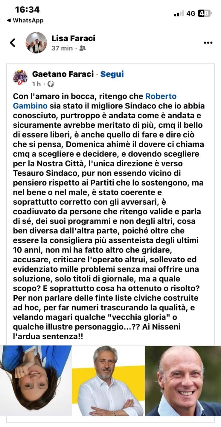 Nessuno, e sottolineo nessuno, mi ha mai indotto, invogliato a scrivere qualcosa nei miei social, non sono un soldatino e mi reputo abbastanza autonomo e indipendente, e quanto scritto nel post è frutto del mio personale pensiero, quindi smentisco categoricamente quanto riportato nel Vs. articolo, come anche la scelta di rimuovere la foto, una volta notato l'errore, è stata una mia personale iniziativa ,che contrariamente a quanto riportato nell'articolo, non è scaturita a seguito delle “numerose proteste e segnalazioni” ( piuttosto il sottoscritto ha ricevuto insulti e minacce di querele da qualche tifoso dello schieramento della Candidata Sindaco), comprendo il periodo “Caldo” e “Nervoso”, che i politici stanno vivendo, e lo Stress dei loro sostenitori,ma di una cosa sono certo, il mio Post non è campagna di incitamento all'odio, semplicemente il mio personale pensiero, basta leggerlo, non ho modificato una sola parola, piuttosto è stato oggetto da parte di qualcuno, di una squallida e opportunistica strumentalizzazione politica, se politica la si chiamare, e di un pessimo processo alle intenzioni. Per fortuna mi conoscono in tanti e chi mi conosce bene, sa di che pasta sono fatto e la persona Rispettosa che sono. Auguro un in bocca al lupo a entrambi i Candidati a Sindaco e che vinca il migliore!