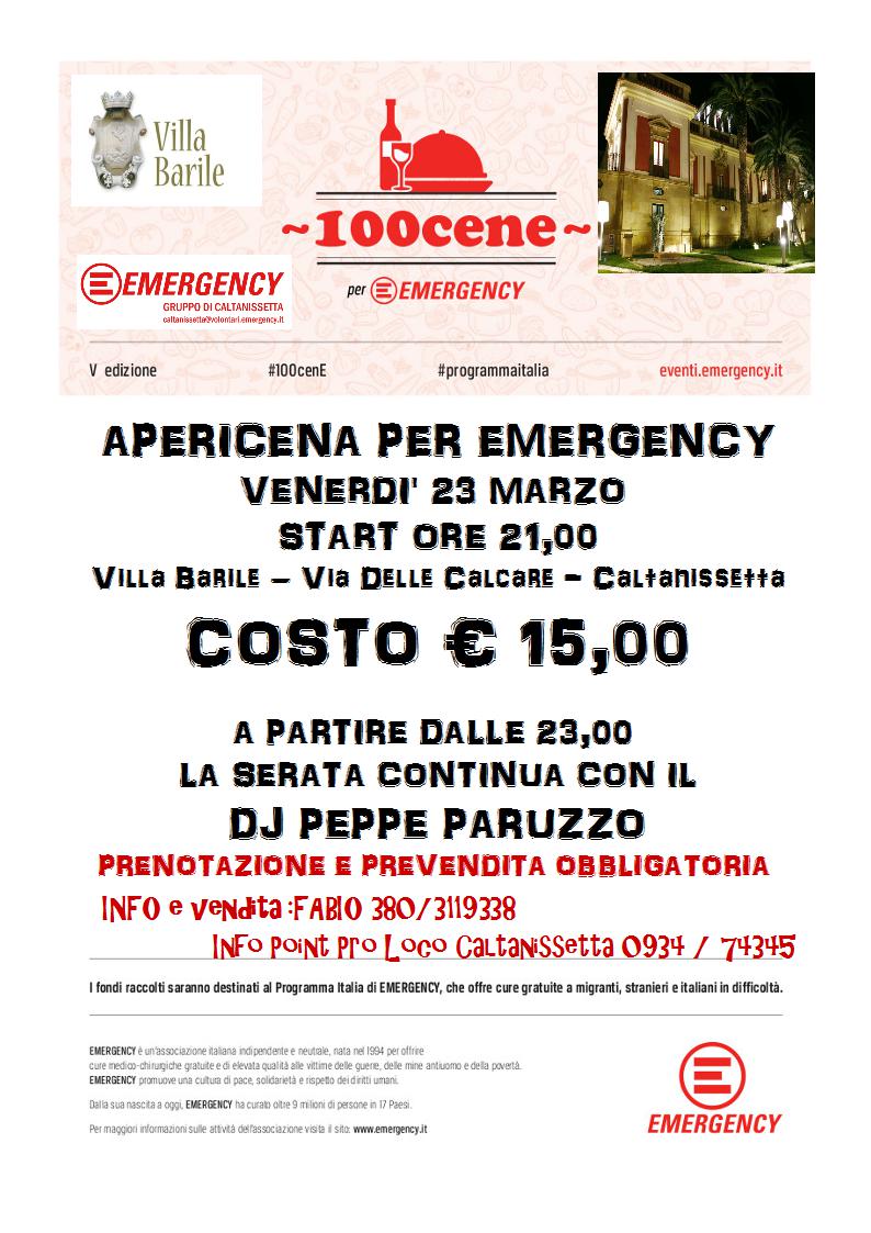Le #100 cene, l’iniziativa di #foodraising più diffusa sul territorio italiano, giunge alla quinta edizione e si consolida come appuntamento di riferimento per gli appassionati di cibo e di giuste cause. L’iniziativa, che attraversa tutte le regioni d’Italia, vede coinvolti cuochi, ristoratori, volontari, appassionati di cucina e di EMERGENCY. Durante il mese di marzo, infatti, i ristoratori coinvolti devolveranno una quota fissa del loro incasso a EMERGENCY, coniugando il piacere della buona tavola con la possibilità di sostenere il Programma Italia, un intervento nato per rendere concreto il diritto alla cura per tutti, anche nel nostro Paese. La Repubblica tutela la salute come fondamentale diritto dell’individuo e interesse della collettività, e garantisce cure gratuite agli indigenti, dice la Costituzione italiana. Eppure, nella pratica, questo diritto è spesso disatteso: migranti, stranieri e sempre più italiani si trovano in condizioni vulnerabili e non hanno accesso alle cure. Durante l’ultima edizione dell’iniziativa sono state realizzate 140 cene e raccolti più di centomila euro destinati al Programma Italia. Oltre a mangiare bene, bere bene e sostenere EMERGENCY, la partecipazione alle cene darà anche la possibilità di incontrare lo staff dell’associazione e scoprire da vicino il nostro lavoro Il gruppo volontari di Caltanisseta anche quest'anno ha aderito organizzando un evento “Apericena per Emergency”. L'evento si terra' venerdì 23 Marzo alle ore 21.00 presso Villa Barile in via delle Calcare a Caltanissetta. La serata dopo l'apericena continuera' con l'animazione del dj Peppe Paruzzo. Il costo del biglietto è di € 15,00 e parte dell'incasso verrà devoluto al Programma Italia Durante la serata saraà presente un banchetto informativo e i volontari saranno disponibili ad incontrarvi per raccontarvi i progetti dell'Associazione. Prevendita obbligatoria: infoline 380/3119338 – 0934/74345. I biglietti sono disponibili anche presso l'info point della Pro Loco di Caltanissetta . Il gruppo volontari Emergency di Caltanissetta.