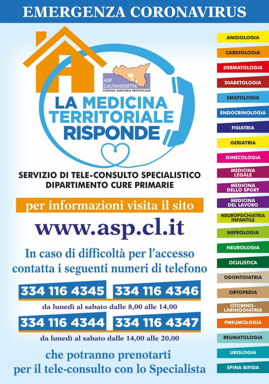 “La medicina territoriale risponde”, si chiama così il nuovo servizio di teleconsulto attivato dall’Asp di Caltanissetta. I pazienti che necessitano di consulenze relative a cardiologia, angiologia, dermatologia, diabetologia, ematologia, endocrinologia, fisiatria, geriatria, ginecologia, medicina legale, medicina dello sport, medicina del lavoro, neuropsichiatria infantile, nefrologia, neurologia, oculistica, odontoiatria, ortopedia, otorinolaringoiatria, pneumologia, reumatologia, urologia e spina bifida potranno informarsi visitando il sito www.asp.cl.it. Qui infatti è contenuto l’elenco dei medici e relativi numeri di telefono da contattare. In caso di difficoltà ad accedere al sito gli utenti potranno contattare i numeri 334-1164345 o 334-1164346, dal lunedì al sabato dalle 8 alle 14, o i numeri 334-1664344 o 334-1664347 dal lunedì al sabato dalle 14 alle 20. “Si tratta di una iniziativa strepitosa – ha detto il direttore generale dell’Asp di Caltanissetta Alessandro Caltagirone – per dare continuità alle attività ambulatoriali. Si potrà fare un teleconsulto per alcune specialistiche e selezionare i soli casi meritevoli di consulto con presenza fisica del medico. Inoltre è attivo il servizio psicologico in questo momento di difficoltà per tante persone fragili”. In questo caso si tratta del servizio “Vicini nella distanza” di cui è possibile usufruire sempre collegandosi al sito dell’Asp.